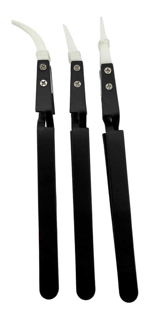 Self closing pressure with black handle, replaceable white ceramic composite tips, sold in set of 3 tweezers